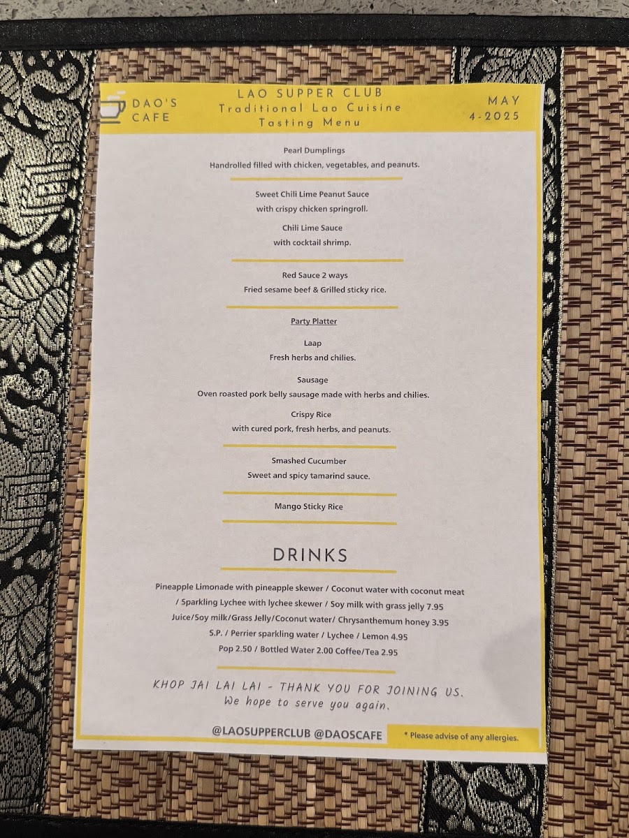 The menu at Dao's Cafe features a selection of traditional Laotian dishes and beverages, organized into several key categories to provide a comprehensive dining experience. It includes appetizers and tasting options such as pearl dumplings served with various dipping sauces, which highlight the textures and flavors characteristic of Laotian cuisine.