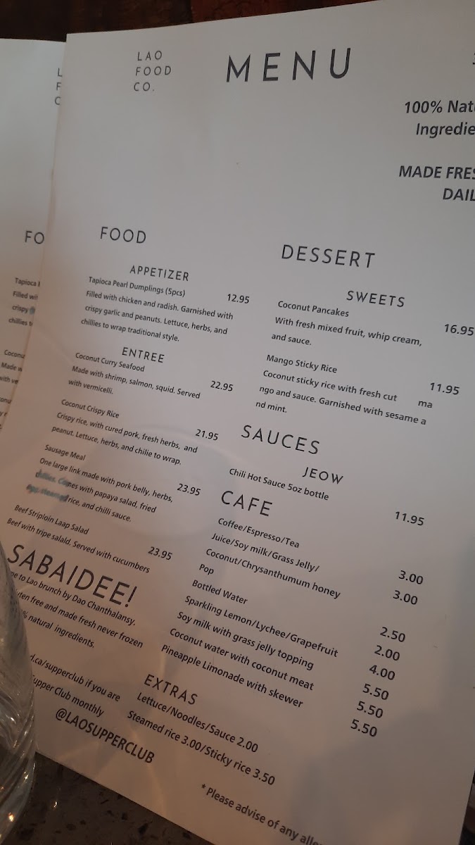 For those seeking lighter or sweet options, the menu offers a variety of desserts including coconut pancakes and mango sticky rice. These items reflect classic Laotian sweets with familiar tropical ingredients.